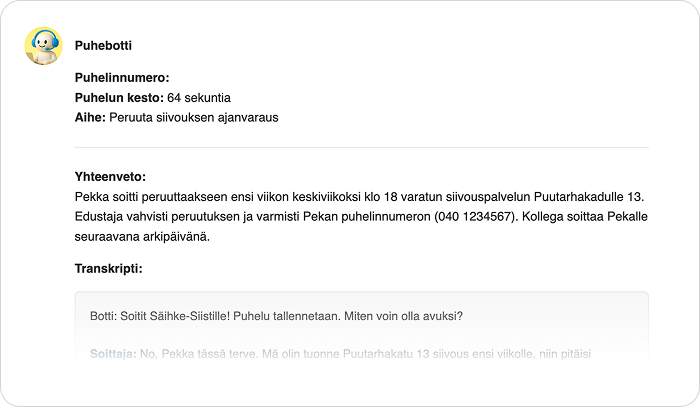 Kuuntele alta esimerkki siivouspalveluyrityksen puhelusta: soittaja asioi älykäs puhelinvastaaja Puhebotin kanssa.